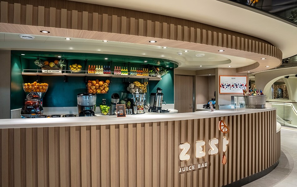 This bar’s got it all! An elegant lounge with stunning aft views, an entertainment venue with stage and drinks that can still steal the limelight. Tickle your fancy with a selection of refreshing cocktails, wine, beer, cider and more, together with alcohol-free options including coffee and tea.